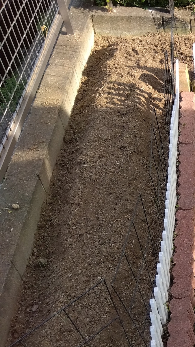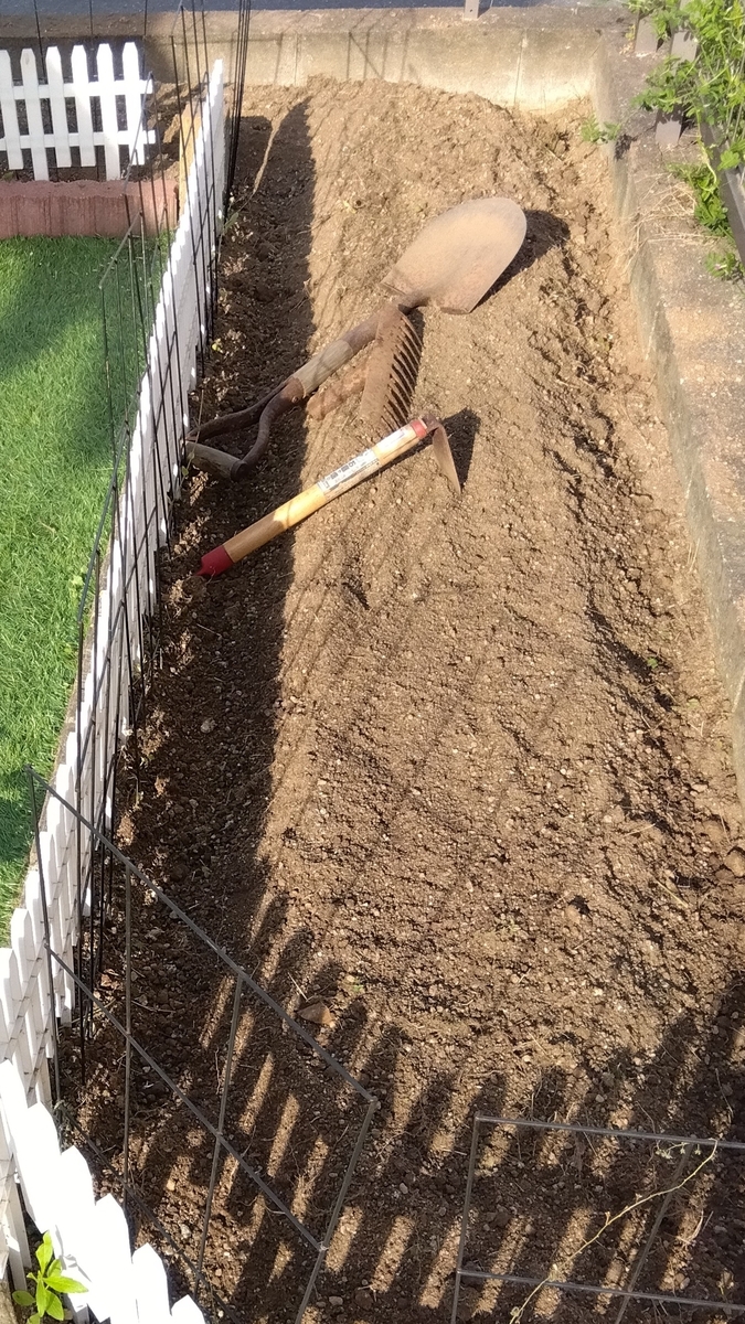 しばらく放置していたスペースは雑草だらけ。草を抜いて、スコップで土を掘り起こし、レーキで整地。力のない私にはなかなかの重労働…。