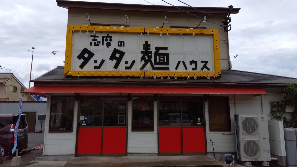 お店に到着してまず目に入ったのは、大きな看板に書かれた「志摩のタンタン麺」の文字。遠くからでもすぐに発見することができる外観で、期待が高まります。