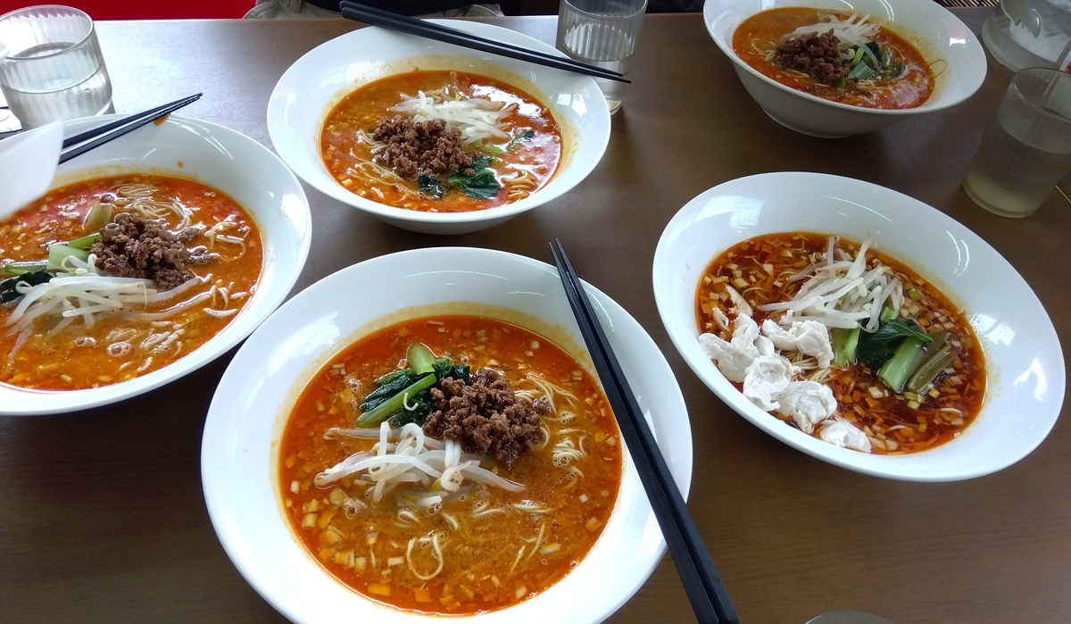 今回は、4人が「タンタン麺」、1人が「サンラータン麺」を選び、サイドメニューとして気になっていた一品料理の「ギョーザスープ」もオーダーしました。
