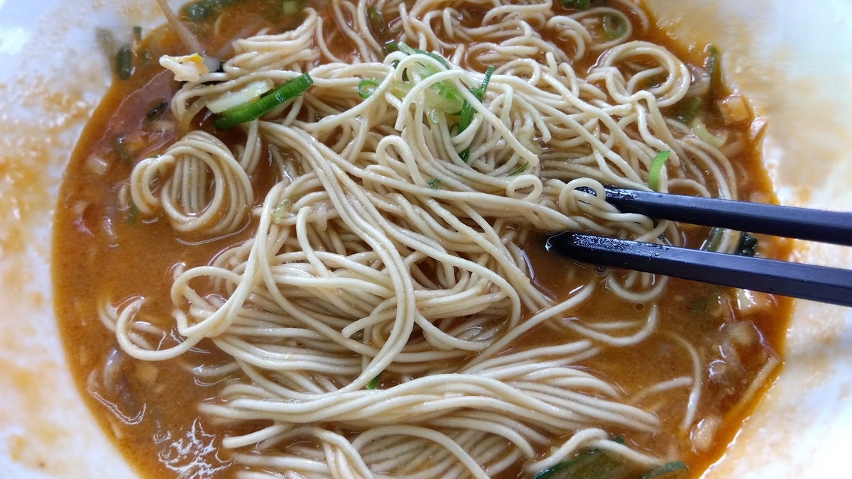 見た目からしてかなり細く、まるで長浜ラーメンのような極細ストレート麺。担々麺でこの細さは珍しいですが、これがスープに絶妙に絡んで抜群の相性!